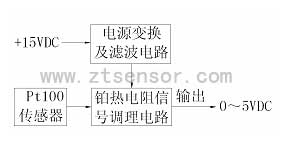 燃油溫度信號變送器的作用是將燃油溫度傳感器在-55℃~300℃范圍內隨溫度變化的鉑熱電阻值變換為隨溫度變化的電壓信號并進行放大與線性修正,轉換為0~5VDC電壓信號輸出。燃油溫度信號變送器采用專用鉑電阻信號調理集成電路并配以少量精密電子元器件,因此電路結構簡單,性能穩定可靠。原理框圖如圖1所示。