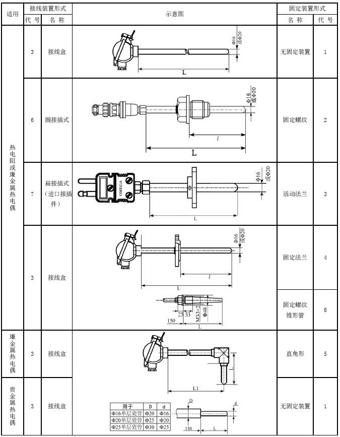裝配式工業熱電偶可以直接測量各種生產過程中的溫度,作為測量溫度的傳感器,其分度表及允差適用于可拆卸的工業熱電偶,通常與顯示儀表、記錄儀表或計算機等配套使用。本公司生產符合行業標準及IEC標準分度號的B、R、S、K、E、J、T、N及Pt100等裝配式工業熱電偶、熱電阻,測量的溫度范圍-40~1600℃,根據使用溫度絲材的直徑從Φ0.3mm~Φ3.2mm可供選擇。