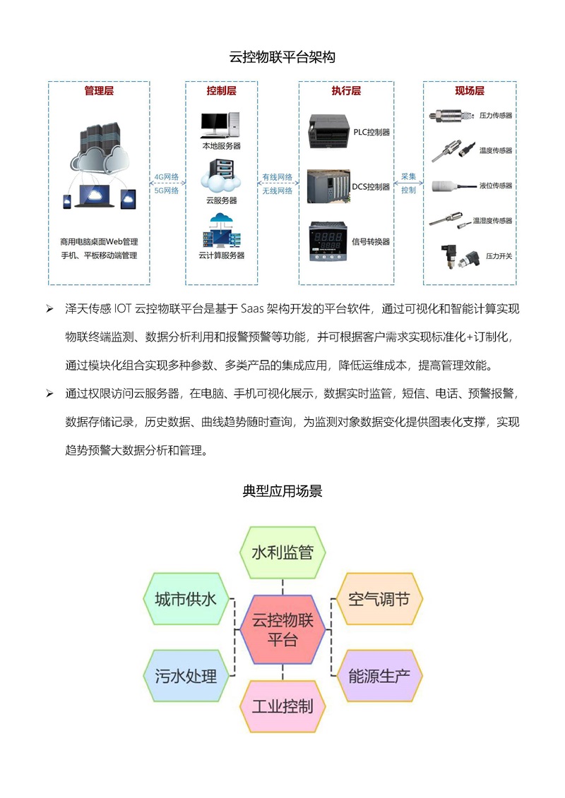 湖南澤天傳感推出新一代智能傳感測控技術--云控物聯解決方案,澤天傳感 IOT 云控物聯平臺是基于 Saas 架構開發的平臺軟件,通過可視化和智能計算實現物聯終端監測、數據分析利用和報警預警等功能,并可根據客戶需求實現標準化+訂制化,通過模塊化組合實現多種參數、多類產品的集成應用,降低運維成本,提高管理效能。通過權限訪問云服務器,在電腦、手機可視化展示,數據實時監管,短信、電話、預警報警,數據存儲記錄,歷史數據、曲線趨勢隨時查詢,為監測對象數據變化提供圖表化支撐,實現趨勢預警大數據分析和管理。