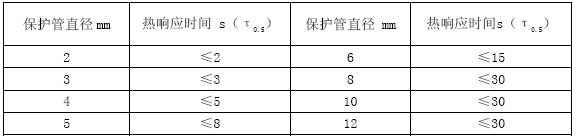 在溫度階躍變化時,溫度傳感器的輸出變化至量程變化的50%所需要的時間稱為熱響應時間,用τ0.5表示。影響τ0.5的因素與保護管材料、直徑、壁厚有關,而且還與其結構形式、安裝方法、置入深度以及被測介質的流速、種類有關。下表為不同直徑保護管的熱響應時間(材質為不銹鋼,水流速度為1m/s,測試數據為參考值)