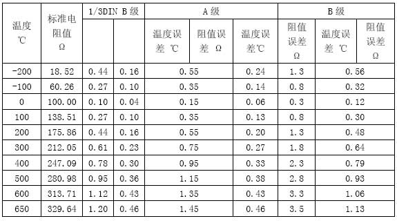 鉑電阻分度表見附件,備注:Pt1000的分度表用Pt100的分度表乘以10, Pt500的分度表用Pt100的分度表乘以5即可。